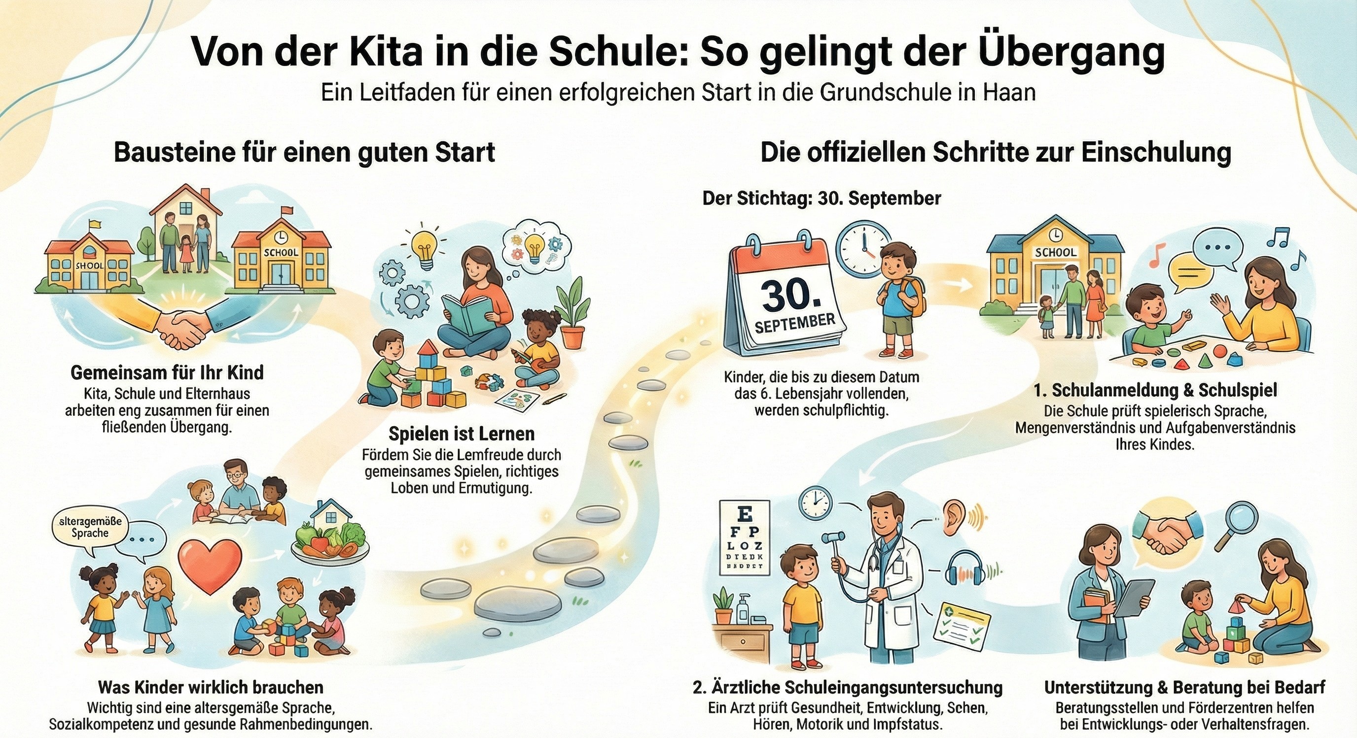Der Übergang in die Schule beginnt nicht erst am Einschulungstag. In Haan arbeiten Kindertagesstätten (Kitas) und Grundschulen eng zusammen, um diesen wichtigen Schritt für Ihr Kind so fließend wie möglich zu gestalten. Diese Kooperation ist im Kinderbildungsgesetz (Kibiz) verankert und wird durch gemeinsam entwickelte Standards gelebt. Konkrete Beispiele für diese enge Partnerschaft sind gegenseitige Hospitationen von Erzieherinnen und Lehrkräften sowie Schnuppertage, an denen die Kindergartenkinder ihre zukünftige Schule besuchen.